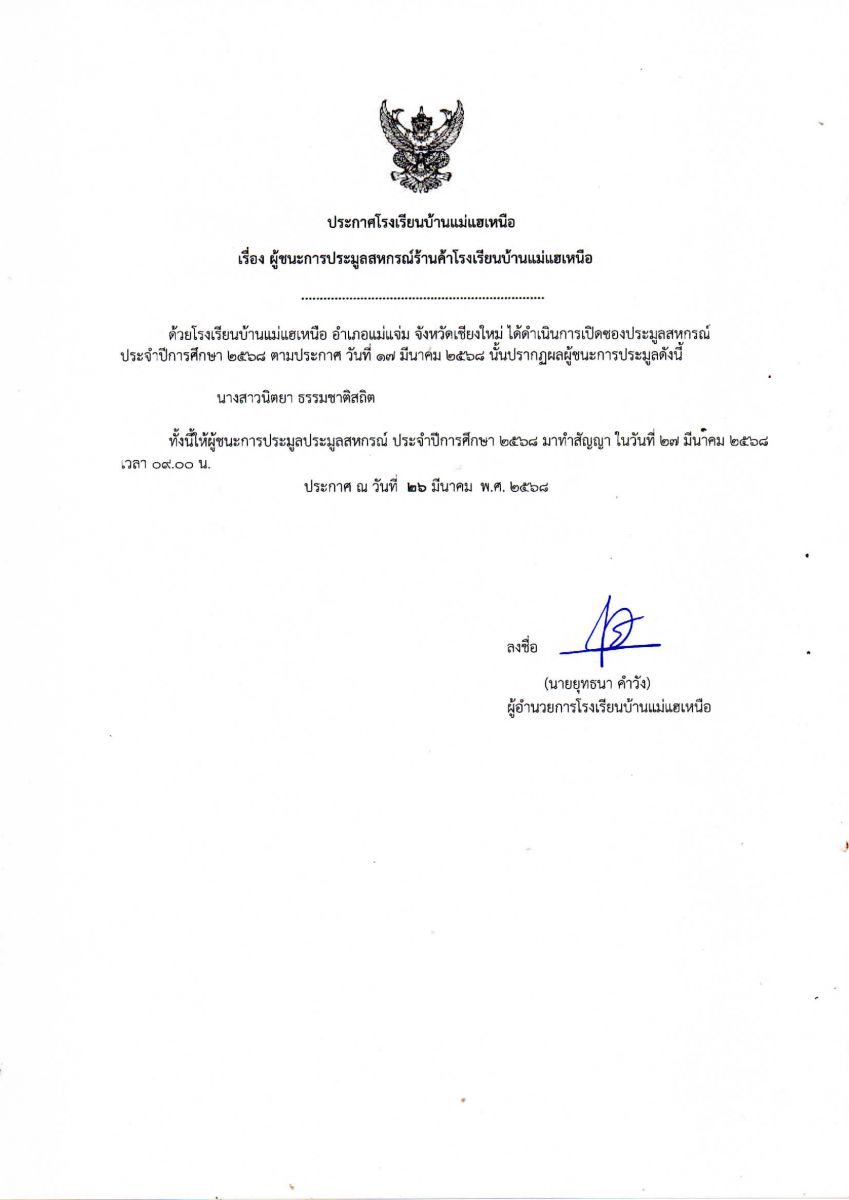 ประกาศผู้ชนะ การประมูลสหกรณ์ร้านค้าโรงเรียนบ้านแม่แฮเหนือ ประจำปีการศึกษา 2568