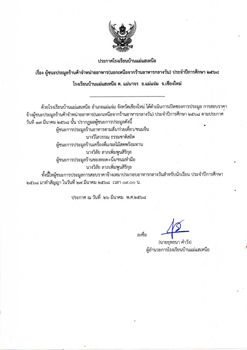 ประกาศผู้ชนะ การประมูลร้านค้าจำหน่ายอาหาร(นอกเหนือจากร้านอาหารกลางวัน) โรงเรียนบ้านแม่แฮเหนือ ประจำปีการศึกษา 2568