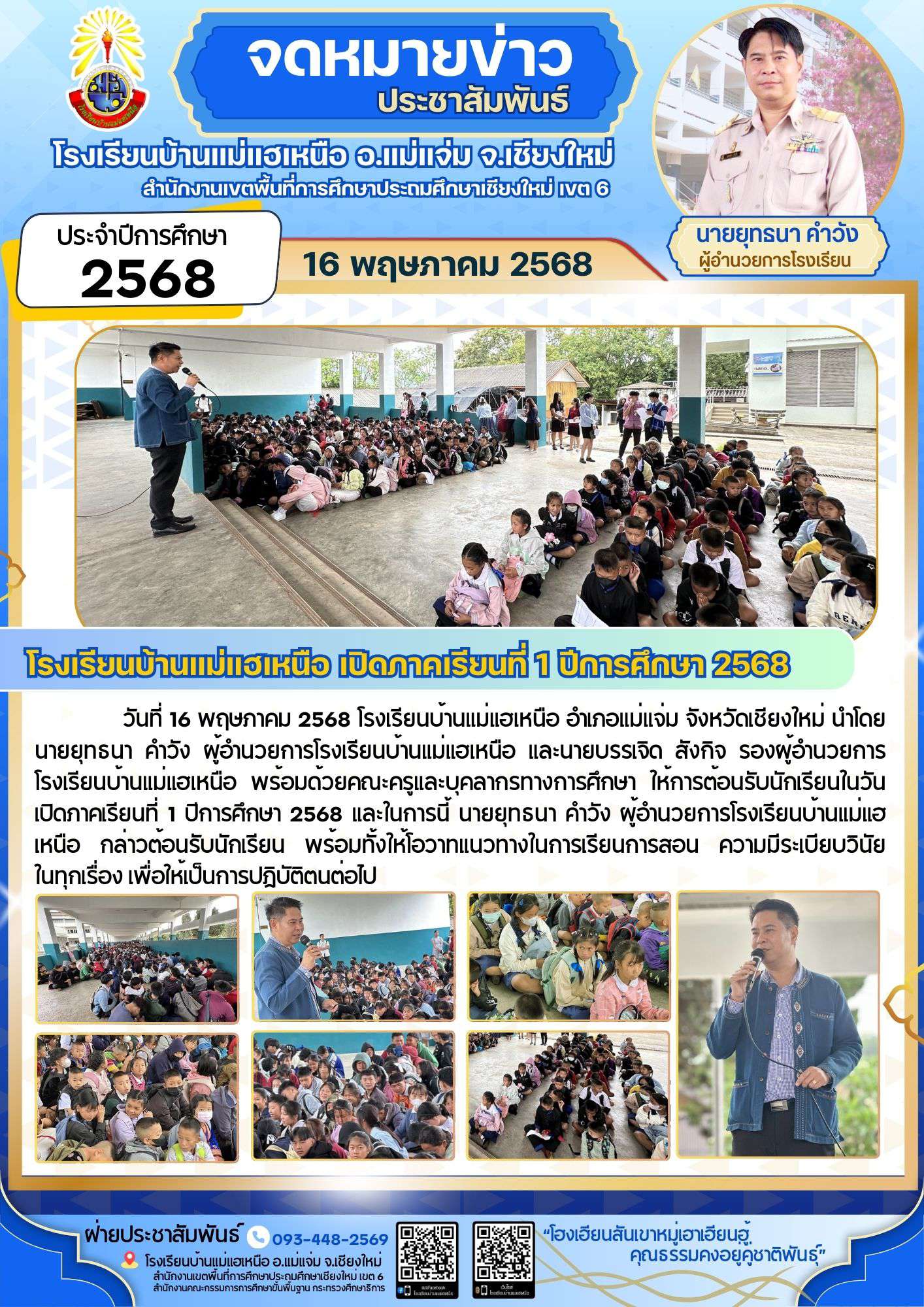 วันที่ 16 พฤษภาคม 2568 โรงเรียนบ้านแม่แฮเหนือ อำเภอแม่แจ่ม จังหวัดเชียงใหม่ นำโดย นายยุทธนา คำวัง ผู้อำนวยการโรงเรียนบ้านแม่แฮเหนือ และนายบรรเจิด สังกิจ รองผู้อำนวยการโรงเรียนบ้านแม่แฮเหนือ พร้อมด้วยคณะครูและบุคลากรทางการศึกษา ให้การต้อนรับนักเรียนในวันเปิดภาคเรียนที่ 1 ปีการศึกษา 2568 และในการนี้ นายยุทธนา คำวัง ผู้อำนวยการโรงเรียนบ้านแม่แฮเหนือ กล่าวต้อนรับนักเรียน พร้อมทั้งให้โอวาทแนวทางในการเรียนการสอน ความมีระเบียบวินัย ในทุกเรื่อง เพื่อให้เป็นการปฏิบัติตนต่อไป