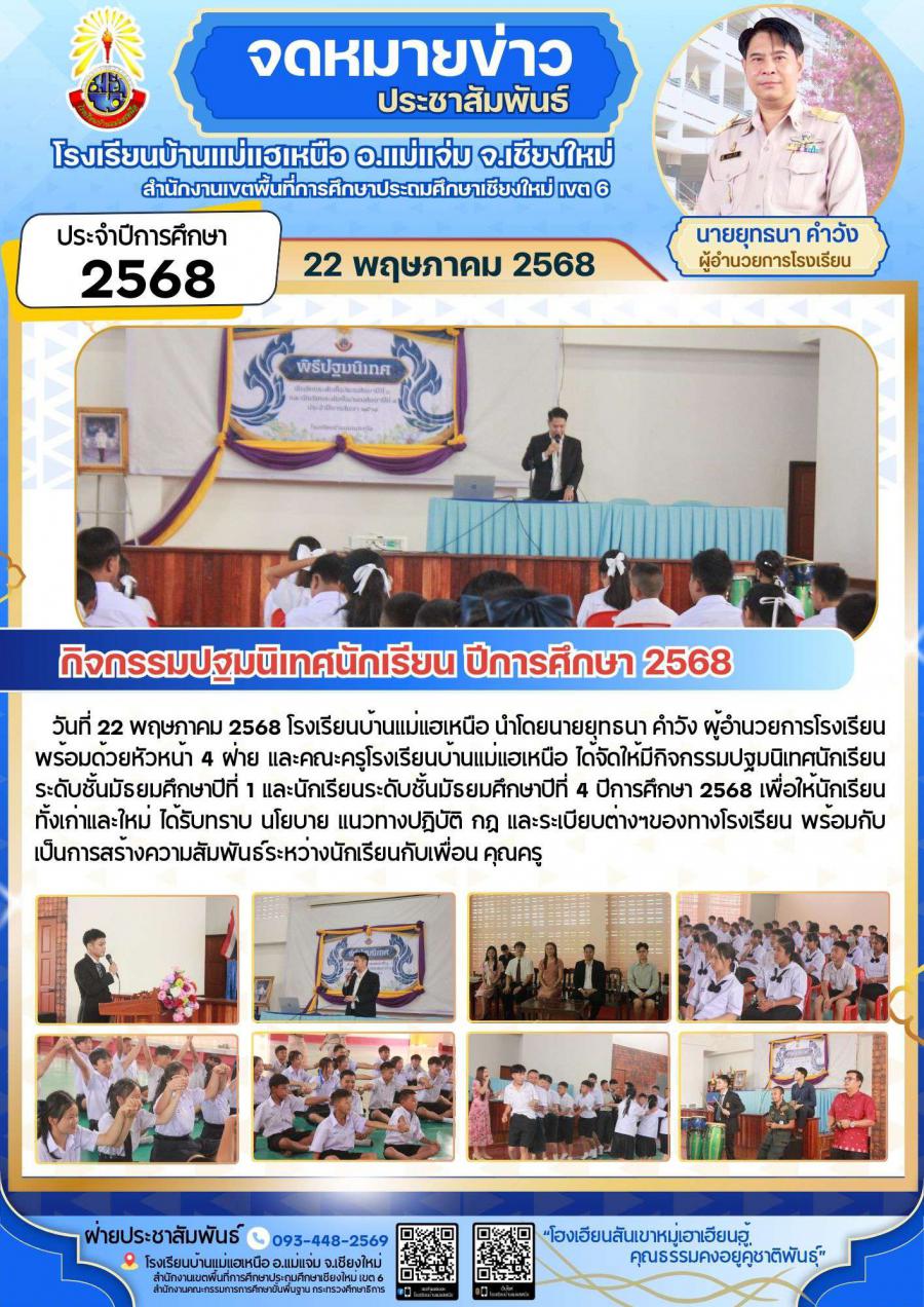 วันที่ 22 พฤษภาคม 2568 โรงเรียนบ้านแม่แฮเหนือ นำโดยนายยุทธนา คำวัง ผู้อำนวยการโรงเรียน พร้อมด้วยหัวหน้า 4 ฝ่าย และคณะครูโรงเรียนบ้านแม่แฮเหนือ ได้จัดให้มีกิจกรรมปฐมนิเทศนักเรียนระดับชั้นมัธยมศึกษาปีที่ 1 และนักเรียนระดับชั้นมัธยมศึกษาปีที่ 4 ปีการศึกษา 2568 เพื่อให้นักเรียนทั้งเก่าและใหม่ ได้รับทราบ นโยบาย แนวทางปฏิบัติ กฎ และระเบียบต่างๆของทางโรงเรียน พร้อมกับเป็นการสร้างความสัมพันธ์ระหว่างนักเรียนกับเพื่อน คุณครู