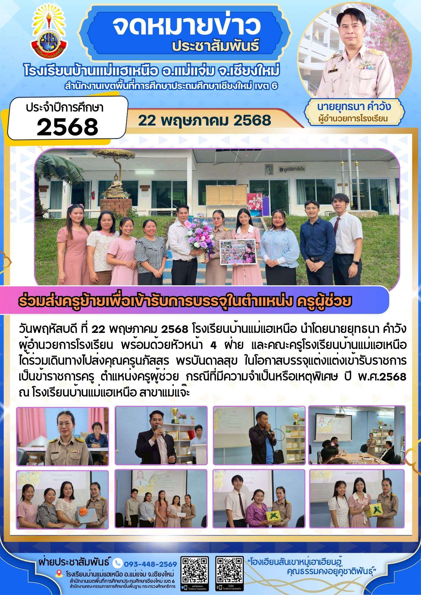 วันพฤหัสบดี ที่ 22 พฤษภาคม 2568 โรงเรียนบ้านแม่แฮเหนือ นำโดยนายยุทธนา คำวัง ผู้อำนวยการโรงเรียน พร้อมด้วยหัวหน้า 4 ฝ่าย และคณะครูโรงเรียนบ้านแม่แฮเหนือ ได้ร่วมเดินทางไปส่งคุณครูนภัสสร พรบันดาลสุข ในโอกาสบรรจุแต่งแต่งเข้ารับราชการเป็นข้าราชการครู ตำแหน่งครูผู้ช่วย กรณีที่มีความจำเป็นหรือเหตุพิเศษ ปี พ.ศ.2568 ณ โรงเรียนบ้านแม่แฮเหนือ สาขาแม่แจ๊ะ