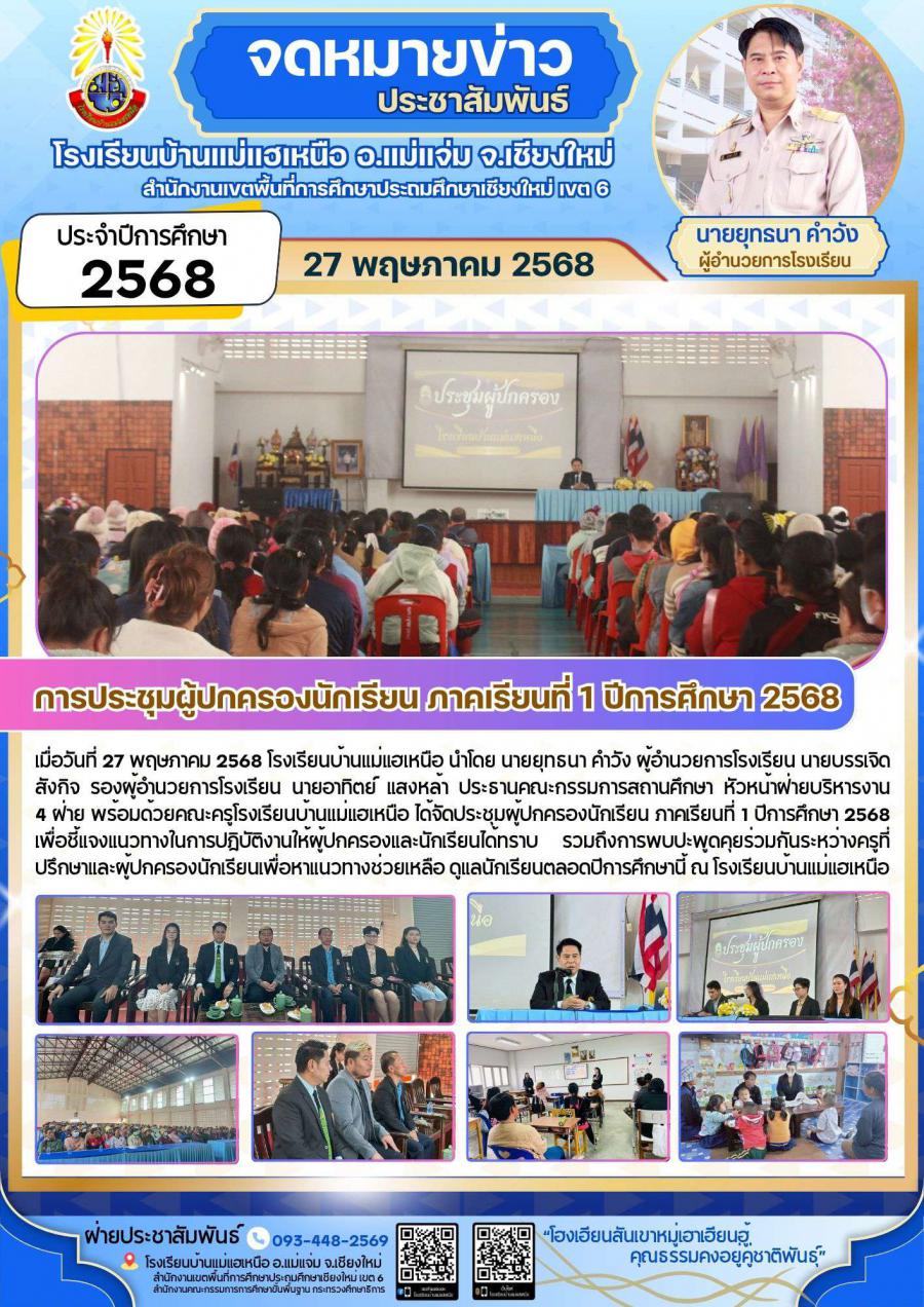 เมื่อวันที่ 27 พฤษภาคม 2568 โรงเรียนบ้านแม่แฮเหนือ นำโดย นายยุทธนา คำวัง ผู้อำนวยการโรงเรียน นายบรรเจิด สังกิจ รองผู้อำนวยการโรงเรียน นายอาทิตย์ แสงหล้า ประธานคณะกรรมการสถานศึกษา หัวหน้าฝ่ายบริหารงาน 4 ฝ่าย พร้อมด้วยคณะครูโรงเรียนบ้านแม่แฮเหนือ ได้จัดประชุมผู้ปกครองนักเรียน ภาคเรียนที่ 1 ปีการศึกษา 2568 เพื่อชี้แจงแนวทางในการปฏิบัติงานให้ผู้ปกครองและนักเรียนได้ทราบ รวมถึงการพบปะพูดคุยร่วมกันระหว่างครูที่ปรึกษาและผู้ปกครองนักเรียนเพื่อหาแนวทางช่วยเหลือ ดูแลนักเรียนตลอดปีการศึกษานี้ ณ โรงเรียนบ้านแม่แฮเหนือ