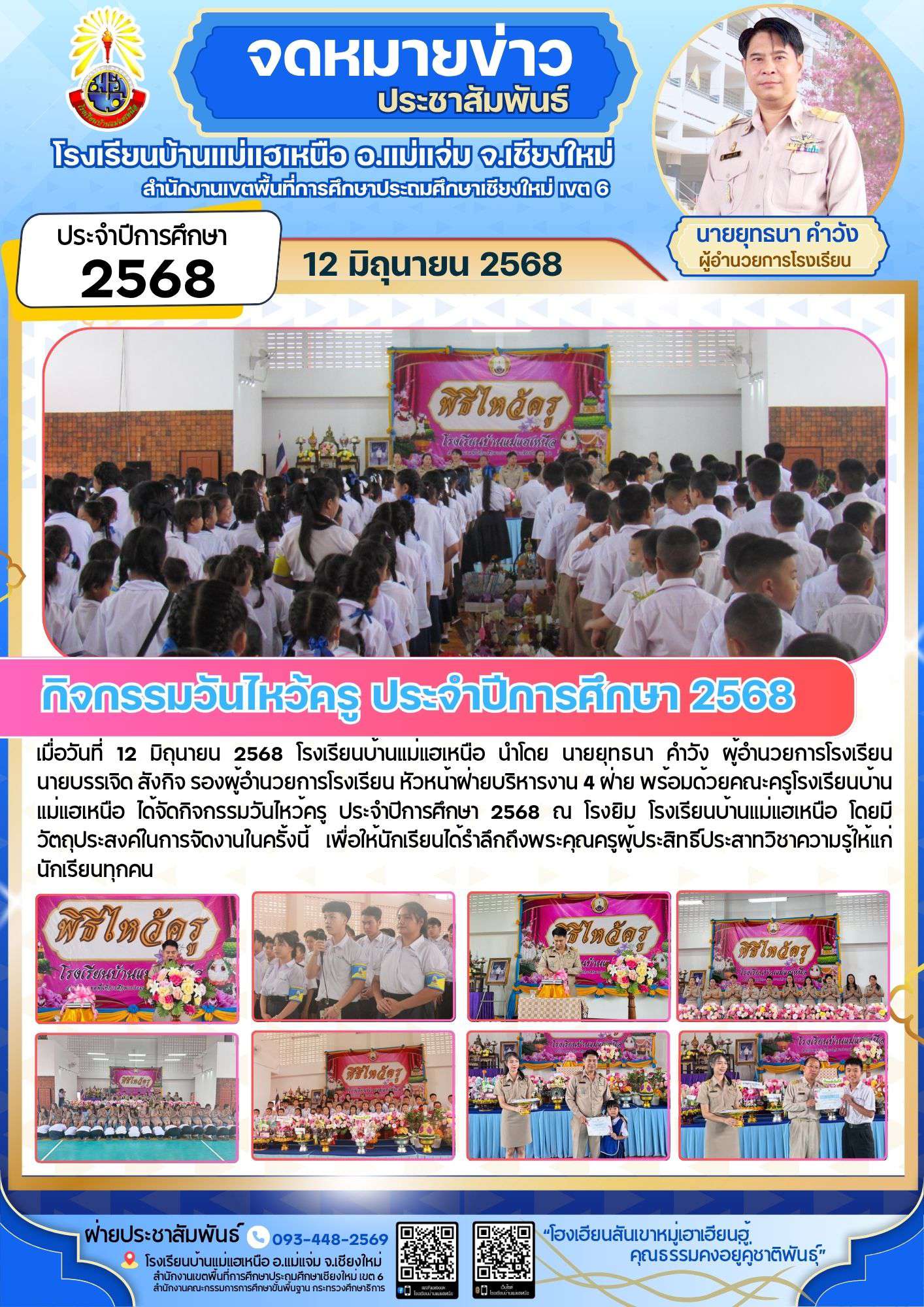 เมื่อวันที่ 12 มิถุนายน 2568 โรงเรียนบ้านแม่แฮเหนือ นำโดย นายยุทธนา คำวัง ผู้อำนวยการโรงเรียน นายบรรเจิด สังกิจ รองผู้อำนวยการโรงเรียน หัวหน้าฝ่ายบริหารงาน 4 ฝ่าย พร้อมด้วยคณะครูโรงเรียนบ้านแม่แฮเหนือ ได้จัดกิจกรรมวันไหว้ครู ประจำปีการศึกษา 2568 ณ โรงยิม โรงเรียนบ้านแม่แฮเหนือ โดยมีวัตถุประสงค์ในการจัดงานในครั้งนี้ เพื่อให้นักเรียนได้รำลึกถึงพระคุณครูผู้ประสิทธิ์ประสาทวิชาความรู้ให้แก่นักเรียนทุกคน
