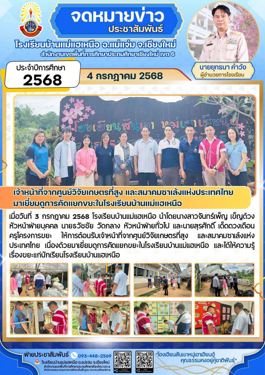 เมื่อวันที่ 3 กรกฎาคม 2568 โรงเรียนบ้านแม่แฮเหนือ นำโดยนางสาวจันทร์เพ็ญ เข็ญด้วง หัวหน้าฝ่ายบุคคล นายธวัชชัย วัดกลาง หัวหน้าฝ่ายทั่วไป และนายสุรศักดิ์ เด็ดดวงเดือน ครูโครงการขยะ ให้การต้อนรับเจ้าหน้าที่จากศูนย์วิจัยเกษตรที่สูง และสมาคมซาเล้งแห่งประเทศไทย เนื่องด้วยมาเยี่ยมดูการคัดแยกขยะในโรงเรียนบ้านแม่แฮเหนือ และได้ให้ความรู้เรื่องขยะแก่นักเรียนโรงเรียนบ้านแฮเหนือ
