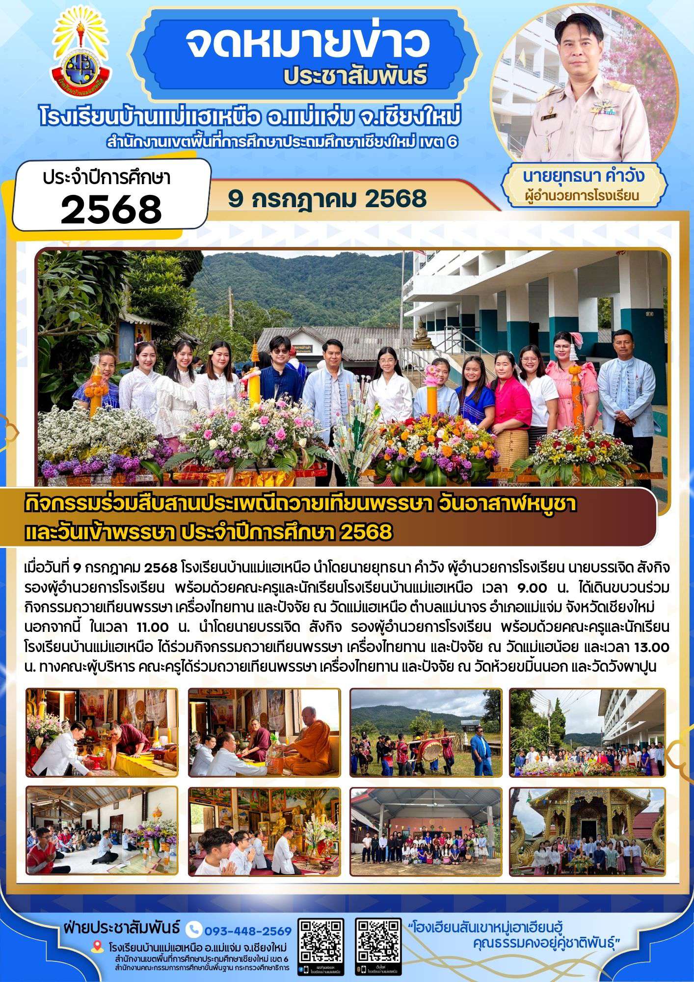 เมื่อวันที่ 9 กรกฎาคม 2568 โรงเรียนบ้านแม่แฮเหนือ นำโดยนายยุทธนา คำวัง ผู้อำนวยการโรงเรียน นายบรรเจิด สังกิจ รองผู้อำนวยการโรงเรียน พร้อมด้วยคณะครูและนักเรียนโรงเรียนบ้านแม่แฮเหนือ เวลา 9.00 น. ได้เดินขบวนร่วมกิจกรรมถวายเทียนพรรษา เครื่องไทยทาน และปัจจัย ณ วัดแม่แฮเหนือ ตำบลแม่นาจร อำเภอแม่แจ่ม จังหวัดเชียงใหม่