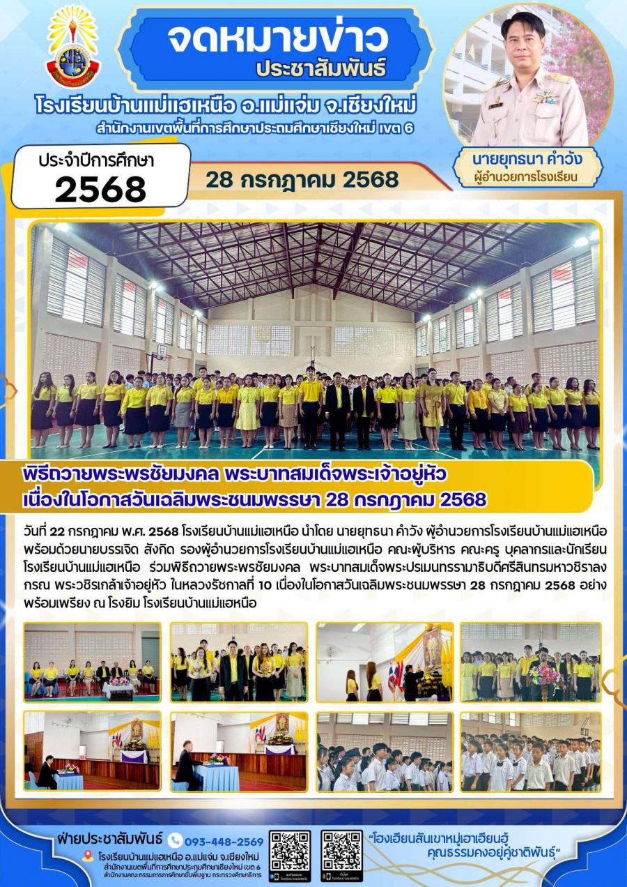 วันที่? 22? กรกฎาคม? พ.ศ.? 2568? โรงเรียนบ้านแม่แฮเหนือ นำโดย นายยุทธนา คำวัง? ผู้?อำนวยการ?โรงเรียน?บ้านแม่แฮเหนือ พร้อมด้วยนายบรรเจิด สังกิด รองผู้อำนวยการโรงเรียนบ้านแม่แฮเหนือ? ?คณะผู้บริหาร? คณะ?ครู? บุคลากร?และ?นักเรียน?โรงเรียนบ้านแม่แฮเหนือ? ร่วมพิธี?ถวายพระพรชัยมงคล? พระบาทสมเด็จพระปรเมนทรรามาธิบดีศรีสินทรมหาวชิราลงกรณ พระวชิรเกล้าเจ้าอยู่หัว ในหลวงรัชกาลที่ 10 เนื่องในโอกาสวันเฉลิมพระชนมพรรษา 28? กรกฎาคม 2568?? อย่างพร้อมเพรียง? ณ โรงยิม โรงเรียนบ้านแม่แฮหนือ