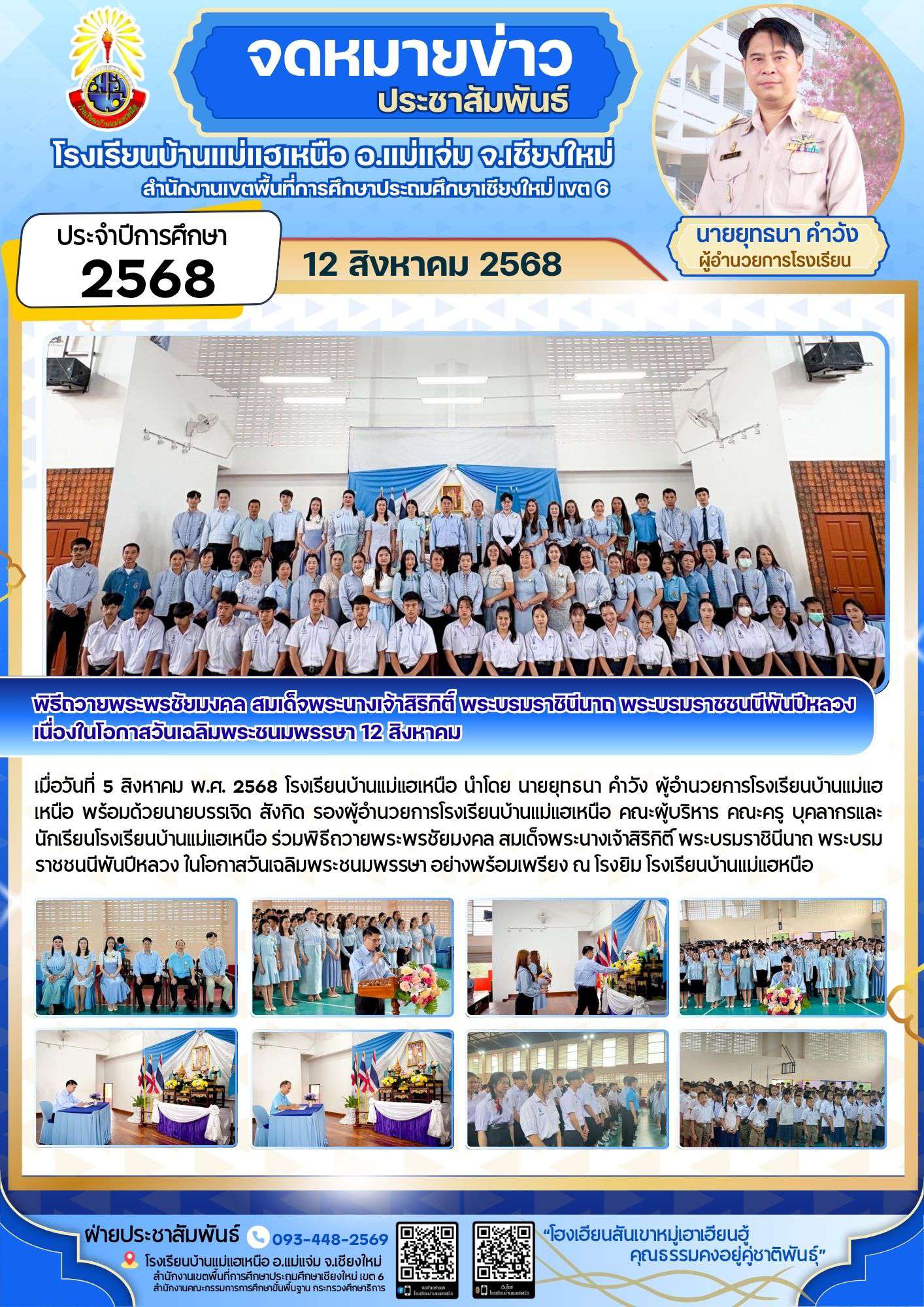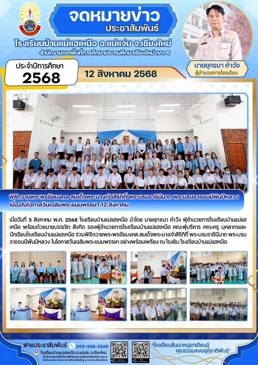 เมื่อวันที่? 5? สิงหาคม? พ.ศ.? 2568? โรงเรียนบ้านแม่แฮเหนือ นำโดย นายยุทธนา คำวัง? ผู้?อำนวยการ?โรงเรียน?บ้านแม่แฮเหนือ พร้อมด้วยนายบรรเจิด สังกิด รองผู้อำนวยการโรงเรียนบ้านแม่แฮเหนือ? ?คณะผู้บริหาร? คณะ?ครู? บุคลากร?และ?นักเรียน?โรงเรียนบ้านแม่แฮเหนือ? ร่วมพิธีถวายพระพรชัยมงคล สมเด็จพระนางเจ้าสิริกิติ์ พระบรมราชินีนาถ พระบรมราชชนนีพันปีหลวง ในโอกาสวันเฉลิมพระชนมพรรษา อย่างพร้อมเพรียง? ณ โรงยิม โรงเรียนบ้านแม่แฮเหนือ