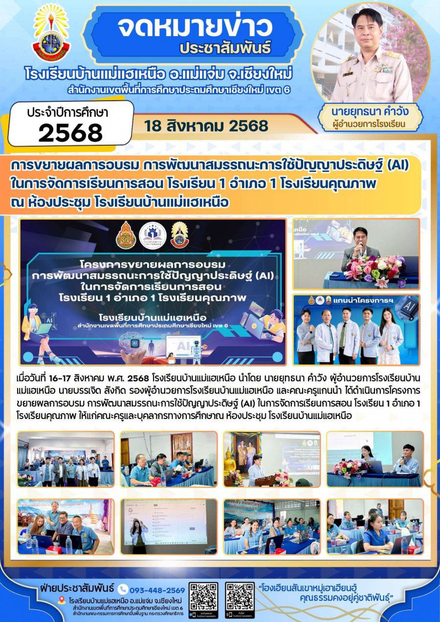 เรื่อง การขยายผลการอบรม การพัฒนาสมรรถนะการใช้ปัญญาประดิษฐ์ (AI) ในการจัดการเรียนการสอน โรงเรียน 1 อำเภอ 1 โรงเรียนคุณภาพ ณ ห้องประชุม โรงเรียนบ้านแม่แฮเหนือ
