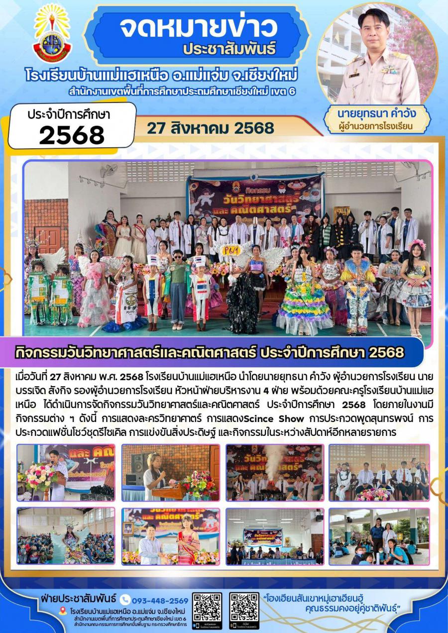 เมื่อวันที่ 27 สิงหาคม พ.ศ. 2568 โรงเรียนบ้านแม่แฮเหนือ นำโดยนายยุทธนา คำวัง ผู้อำนวยการโรงเรียน นายบรรเจิด สังกิจ รองผู้อำนวยการโรงเรียน หัวหน้าฝ่ายบริหารงาน 4 ฝ่าย พร้อมด้วยคณะครูโรงเรียนบ้านแม่แฮเหนือ ได้ดำเนินการจัดกิจกรรมวันวิทยาศาสตร์และคณิตศาสตร์ ประจำปีการศึกษา 2568 โดยภายในงานมีกิจกรรมต่าง ๆ ดังนี้ การแสดงละครวิทยาศาตร์ การแสดงScince Show การประกวดพูดสุนทรพจน์ การประกวดแฟชั่นโชว์ชุดรีไซเคิล การแข่งขันสิ่งประดิษฐ์ และกิจกรรมในระหว่างสัปดาห์อีกหลายรายการ