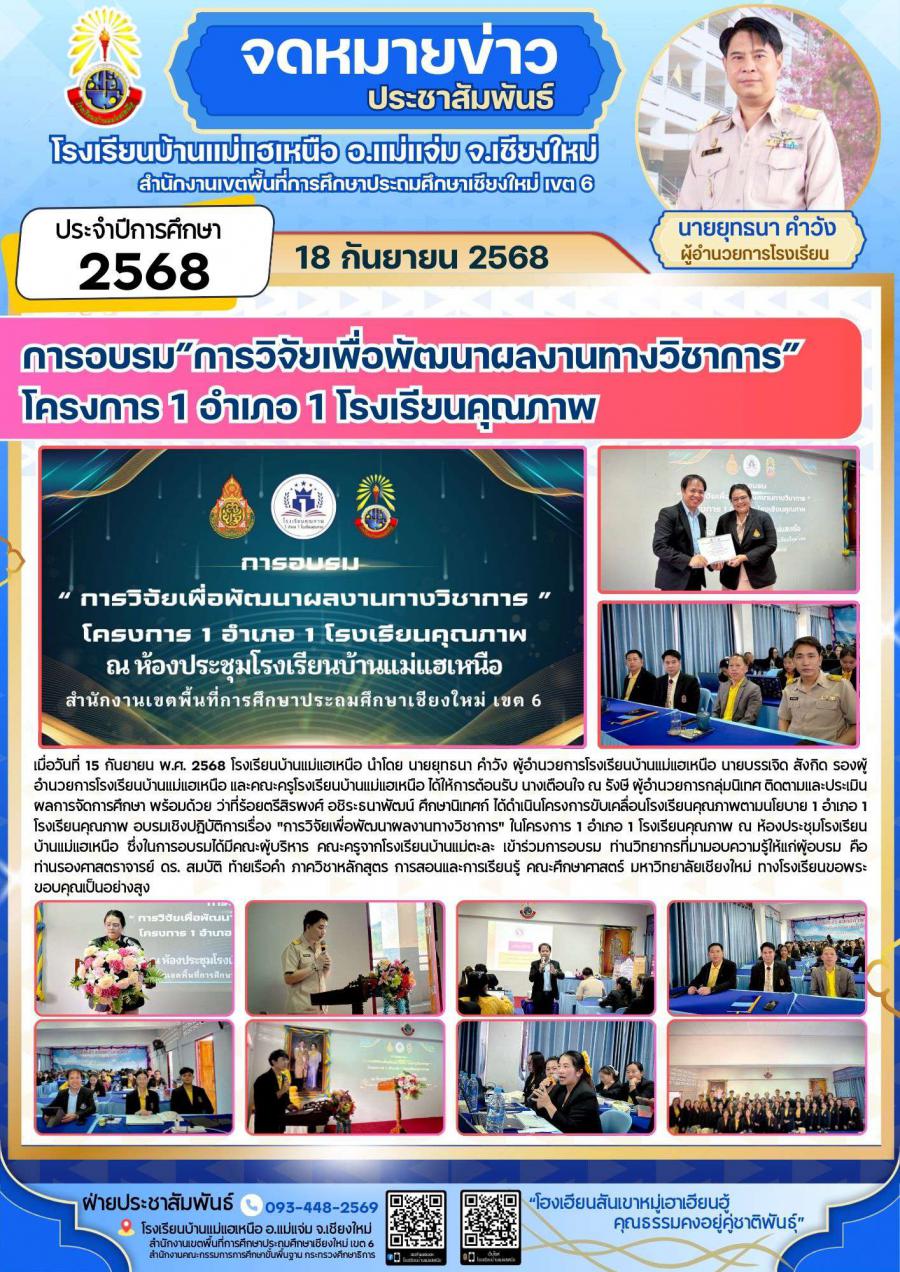 เมื่อวันที่? 15 กันยายน? พ.ศ.? 2568? โรงเรียนบ้านแม่แฮเหนือ นำโดย นายยุทธนา คำวัง? ผู้?อำนวยการ?โรงเรียน?บ้านแม่แฮเหนือ นายบรรเจิด สังกิด รองผู้อำนวยการโรงเรียนบ้านแม่แฮเหนือ? ?และคณะ?ครูโรงเรียนบ้านแม่แฮเหนือ ได้ให้การต้อนรับ นางเตือนใจ ณ รังษี ผู้อำนวยการกลุ่มนิเทศ ติดตามและประเมินผลการจัดการศึกษา พร้อมด้วย ว่าที่ร้อยตรีสิรพงศ์ อชิระธนาพัฒน์ ศึกษานิเทศก์ ได้ดำเนินโครงการขับเคลื่อนโรงเรียนคุณภาพตามนโยบาย 1 อำเภอ 1 โรงเรียนคุณภาพ อบรมเชิงปฏิบัติการเรื่อง "การวิจัยเพื่อพัฒนาผลงานทางวิชาการ" ในโครงการ 1 อำเภอ 1 โรงเรียนคุณภาพ ณ ห้องประชุมโรงเรียนบ้านแม่แฮเหนือ ซึ่งในการอบรมได้มีคณะผู้บริหาร คณะครูจากโรงเรียนบ้านแม่ตะละ เข้าร่วมการอบรม ท่านวิทยากรที่มามอบความรู้ให้แก่ผู้อบรม คือ ท่านรองศาสตราจารย์ ดร. สมบัติ ท้ายเรือคำ ภาควิชาหลักสูตร การสอนและการเรียนรู้ คณะศึกษาศาสตร์ มหาวิทยาลัยเชียงใหม่ ทางโรงเรียนขอขอบคุณเป็นอย่างสูง