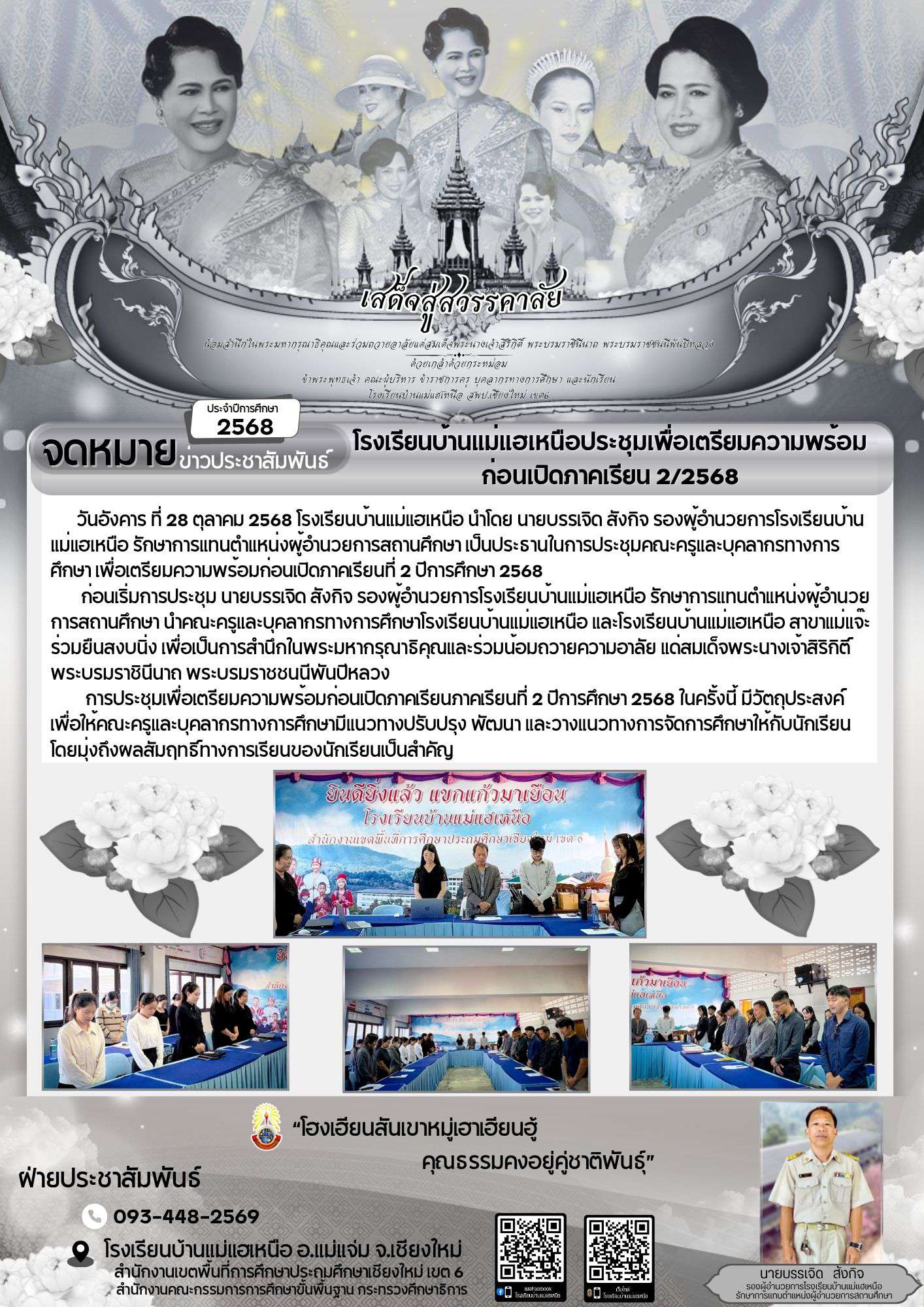 วันอังคาร ที่ 28 ตุลาคม 2568 โรงเรียนบ้านแม่แฮเหนือ นำโดย นายบรรเจิด สังกิจ รองผู้อำนวยการโรงเรียนบ้านแม่แฮเหนือ รักษาการแทนตำแหน่งผู้อำนวยการสถานศึกษา เป็นประธานในการประชุมคณะครูและบุคลากรทางการศึกษา เพื่อเตรียมความพร้อมก่อนเปิดภาคเรียนที่ 2 ปีการศึกษา 2568