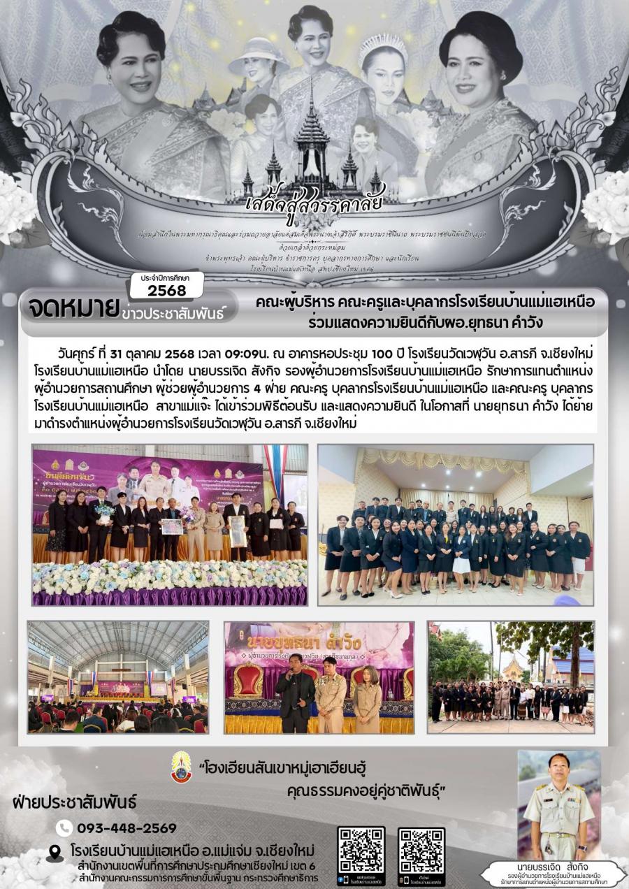 วันศุกร์ ที่ 31 ตุลาคม 2568 เวลา 09:09น. ณ อาคารหอประชุม 100 ปี โรงเรียนวัดเวฬุวัน อ.สารภี จ.เชียงใหม่โรงเรียนบ้านแม่แฮเหนือ นำโดย นายบรรเจิด สังกิจ รองผู้อำนวยการโรงเรียนบ้านแม่แฮเหนือ รักษาการแทนตำแหน่ง ผู้อำนวยการสถานศึกษา ผู้ช่วยผู้อำนวยการ 4 ฝ่าย คณะครู บุคลากรโรงเรียนบ้านแม่แฮเหนือ และคณะครู บุคลากรโรงเรียนบ้านแม่แฮเหนือ สาขาแม่แจ๊ะ ได้เข้าร่วมพิธีต้อนรับ และแสดงความยินดี ในโอกาสที่ นายยุทธนา คำวัง ได้ย้ายมาดำรงตำแหน่งผู้อำนวยการโรงเรียนวัดเวฬุวัน อ.สารภี จ.เชียงใหม่