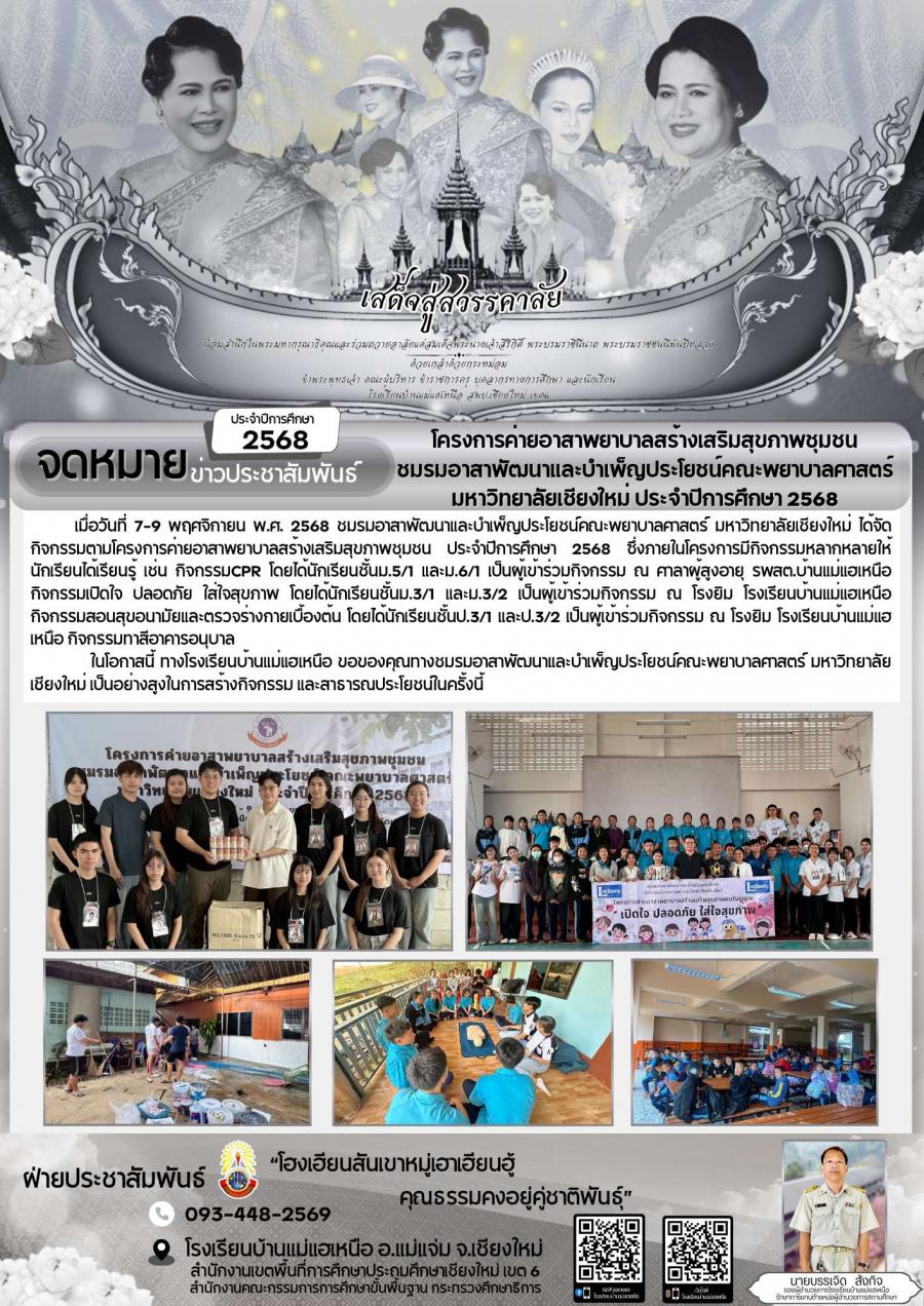 เมื่อวันที่ 7-9 พฤศจิกายน พ.ศ. 2568 ชมรมอาสาพัฒนาและบำเพ็ญประโยชน์คณะพยาบาลศาสตร์ มหาวิทยาลัยเชียงใหม่ ได้จัดกิจกรรมตามโครงการค่ายอาสาพยาบาลสร้างเสริมสุขภาพชุมชน ประจำปีการศึกษา 2568 ซึ่งภายในโครงการมีกิจกรรมหลากหลายให้นักเรียนได้เรียนรู้ เช่น กิจกรรมCPR โดยได้นักเรียนชั้นม.5/1 และม.6/1 เป็นผู้เข้าร่วมกิจกรรม ณ ศาลาผู้สูงอายุ รพสต.บ้านแม่แฮเหนือ กิจกรรมเปิดใจ ปลอดภัย ใส่ใจสุขภาพ โดยได้นักเรียนชั้นม.3/1 และม.3/2 เป็นผู้เข้าร่วมกิจกรรม ณ โรงยิม โรงเรียนบ้านแม่แฮเหนือ กิจกรรมสอนสุขอนามัยและตรวจร่างกายเบื้องต้น โดยได้นักเรียนชั้นป.3/1 และป.3/2 เป็นผู้เข้าร่วมกิจกรรม ณ โรงยิม โรงเรียนบ้านแม่แฮเหนือ กิจกรรมทาสีอาคารอนุบาล