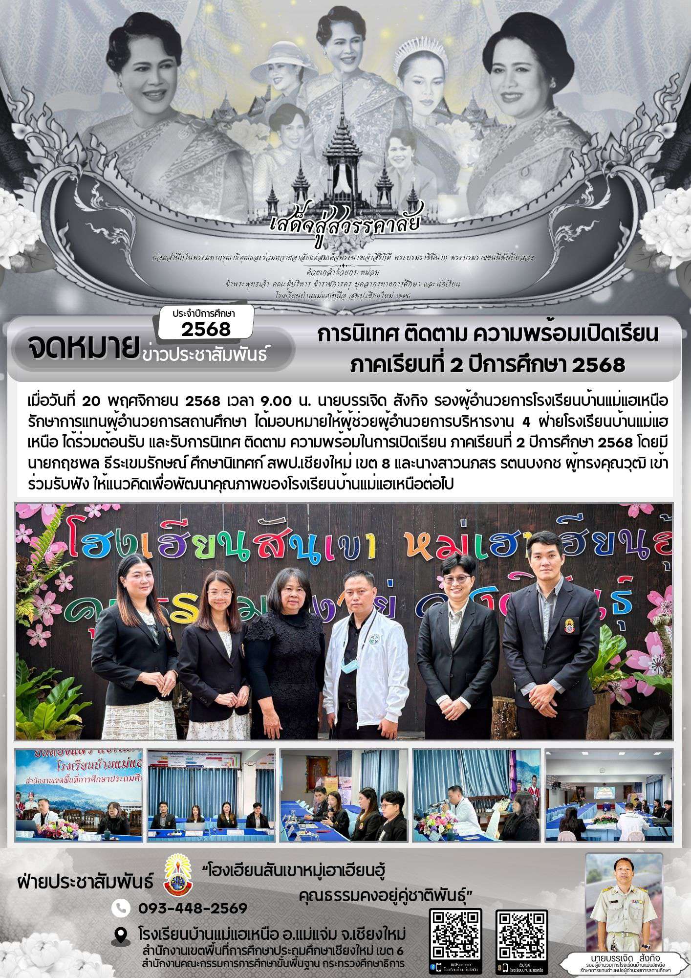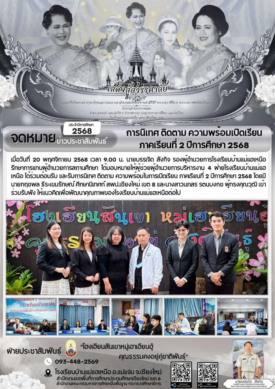 เมื่อวันที่ 20 พฤศจิกายน 2568 เวลา 9.00 น. นายบรรเจิด สังกิจ รองผู้อำนวยการโรงเรียนบ้านแม่แฮเหนือ รักษาการแทนผู้อำนวยการสถานศึกษา ได้มอบหมายให้ผู้ช่วยผู้อำนวยการบริหารงาน 4 ฝ่ายโรงเรียนบ้านแม่แฮเหนือ ได้ร่วมต้อนรับ และรับการนิเทศ ติดตาม ความพร้อมในการเปิดเรียน ภาคเรียนที่ 2 ปีการศึกษา 2568 โดยมีนายกฤชพล ธีระเขมรักษณ์ ศึกษานิเทศก์ สพป.เชียงใหม่ เขต 8 และนางสาวนภสร รตนบงกช ผู้ทรงคุณวุฒิ เข้าร่วมรับฟัง ให้แนวคิดเพื่อพัฒนาคุณภาพของโรงเรียนบ้านแม่แฮเหนือต่อไป