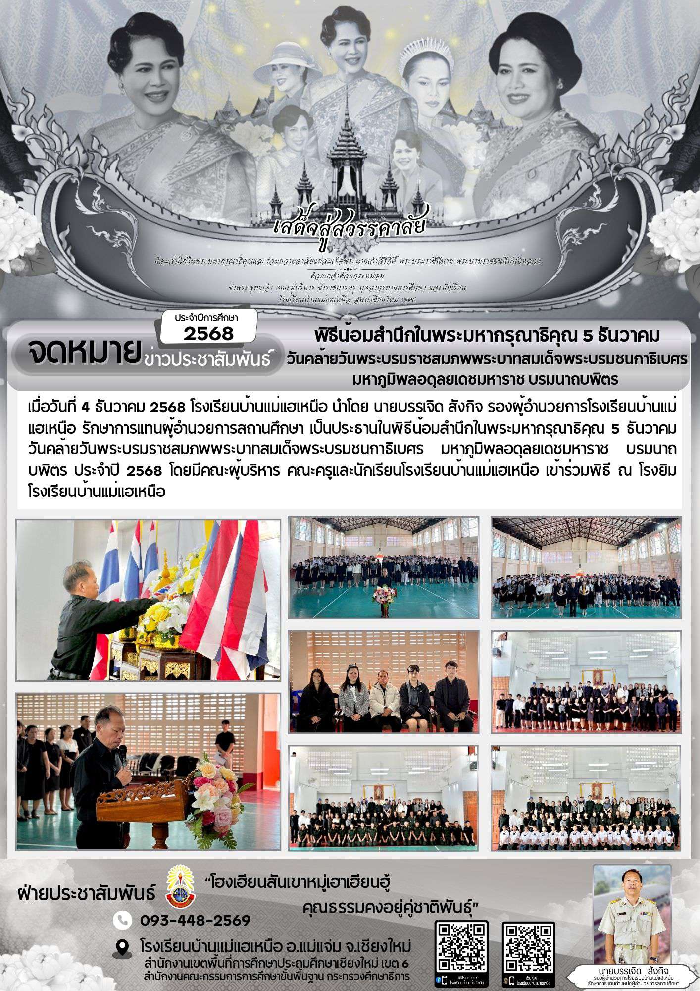 เมื่อวันที่ 4 ธันวาคม 2568 โรงเรียนบ้านแม่แฮเหนือ นำโดย นายบรรเจิด สังกิจ รองผู้อำนวยการโรงเรียนบ้านแม่แฮเหนือ รักษาการแทนผู้อำนวยการสถานศึกษา เป็นประธานในพิธีน้อมสำนึกในพระมหากรุณาธิคุณ 5 ธันวาคม วันคล้ายวันพระบรมราชสมภพพระบาทสมเด็จพระบรมชนกาธิเบศร มหาภูมิพลอดุลยเดชมหาราช บรมนาถบพิตร ประจำปี 2568 โดยมีคณะผู้บริหาร คณะครูและนักเรียนโรงเรียนบ้านแม่แฮเหนือ เข้าร่วมพิธี ณ โรงยิม โรงเรียนบ้านแม่แฮเหนือ
