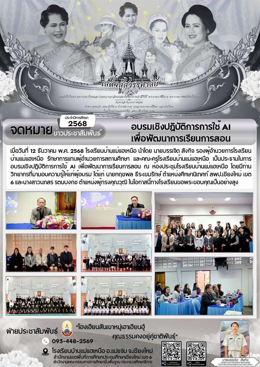 เมื่อวันที่ 12 ธันวาคม พ.ศ. 2568 โรงเรียนบ้านแม่แฮเหนือ นำโดย นายบรรเจิด สังกิจ รองผู้อำนวยการโรงเรียนบ้านแม่แฮเหนือ รักษาการแทนผู้อำนวยการสถานศึกษา และคณะครูโรงเรียนบ้านแม่แฮเหนือ เป็นประธานในการอบรมเชิงปฏิบัติการการใช้ AI เพื่อพัฒนาการเรียนการสอน ณ ห้องประชุมโรงเรียนบ้านแม่แฮเหนือ โดยมีท่านวิทยากรที่มามอบความรู้ให้แก่ผู้อบรม ได้แก่ นายกฤชพล ธีระเขมรักษ์ ตำแหน่งศึกษานิเทศก์ สพป.เชียงใหม่ เขต 6 และนางสาวนภสร รตนบงกช ตำแหน่งผู้ทรงคุณวุฒิ ในโอกาสนี้ทางโรงเรียนขอพระขอบคุณเป็นอย่างสูง