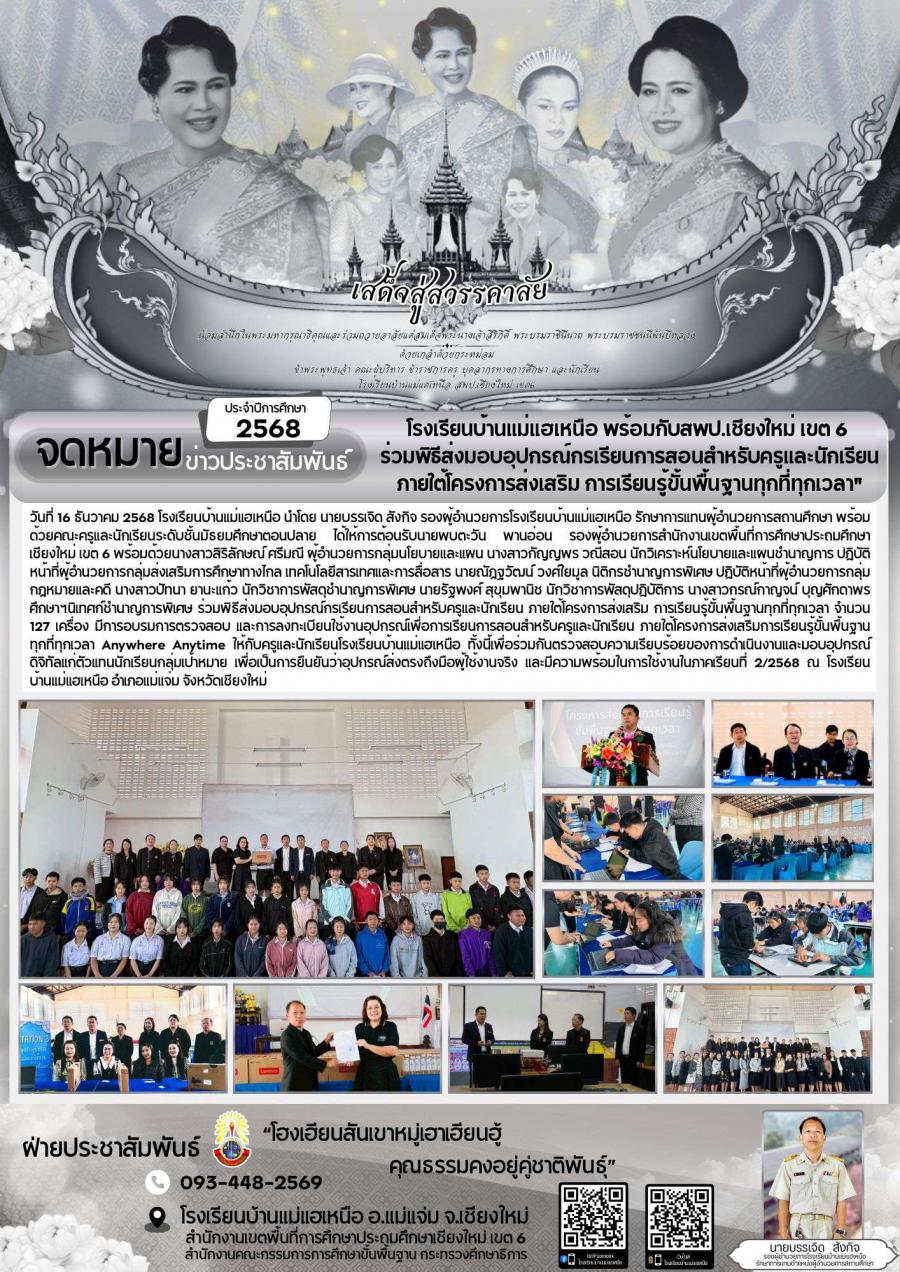 วันที่ 16 ธันวาคม 2568 โรงเรียนบ้านแม่แฮเหนือ นำโดย นายบรรเจิด สังกิจ รองผู้อำนวยการโรงเรียนบ้านแม่แฮเหนือ รักษาการแทนผู้อำนวยการสถานศึกษา พร้อมด้วยคณะครูและนักเรียนระดับชั้นมัธยมศึกษาตอนปลาย ได้ให้การต้อนรับนายพบตะวัน พานอ่อน รองผู้อำนวยการสำนักงานเขตพื้นที่การศึกษาประถมศึกษาเชียงใหม่ เขต 6 พร้อมด้วยนางสาวสิริลักษณ์ ศรีมณี ผู้อำนวยการกลุ่มนโยบายและแผน นางสาวกัญญพร วณีสอน นักวิเคราะห์นโยบายและแผนชำนาญการ ปฏิบัติหน้าที่ผู้อำนวยการกลุ่มส่งเสริมการศึกษาทางไกล เทคโนโลยีสารเทศและการสื่อสาร นายณัฎฐวัฒน์ วงศ์ใยมูล นิติกรชำนาญการพิเศษ ปฏิบัติหน้าที่ผู้อำนวยการกลุ่มกฎหมายและคดี นางสาวปัทนา ยานะแก้ว นักวิชาการพัสดุชำนาญการพิเศษ นายรัฐพงศ์ สุขุมพานิช นักวิชาการพัสดุปฏิบัติการ นางสาวกรณ์กาญจน์ บุญศักดาพร ศึกษาฯนิเทศก์ชำนาญการพิเศษ ร่วมพิธีส่งมอบอุปกรณ์กรเรียนการสอนสำหรับครูและนักเรียน ภายใต้โครงการส่งเสริม การเรียนรู้ขั้นพื้นฐานทุกที่ทุกเวลา จำนวน 127 เครื่อง มีการอบรมการตรวจสอบ และการลงทะเบียนใช้งานอุปกรณ์เพื่อการเรียนการสอนสำหรับครูและนักเรียน ภายใต้โครงการส่งเสริมการเรียนรู้ขั้นพื้นฐานทุกที่ทุกเวลา Anywhere Anytime ให้กับครูและนักเรียนโรงเรียนบ้านแม่แฮเหนือ ทั้งนี้เพื่อร่วมกันตรวจสอบความเรียบร้อยของการดำเนินงานและมอบอุปกรณ์ดิจิทัลแก่ตัวแทนนักเรียนกลุ่มเป้าหมาย เพื่อเป็นการยืนยันว่าอุปกรณ์ส่งตรงถึงมือผู้ใช้งานจริง และมีความพร้อมในการใช้งานในภาคเรียนที่ 2/2568 ณ โรงเรียนบ้านแม่แฮเหนือ อำเภอแม่แจ่ม จังหวัดเชียงใหม่