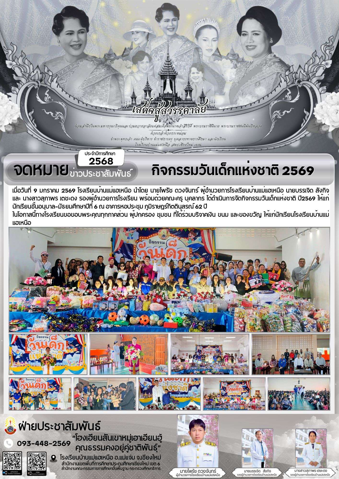 เมื่อวันที่ 9 มกราคม 2569 โรงเรียนบ้านแม่แฮเหนือ นำโดย นายไพรัช ดวงจันทร์ ผู้อำนวยการโรงเรียนบ้านแม่แฮเหนือ นายบรรเจิด สังกิจ และ นางสาวสุภาพร เตชะดง รองผู้อำนวยการโรงเรียน พร้อมด้วยคณะครู บุคลากร ได้ดำเนินการจัดกิจกรรมวันเด็กแห่งชาติ ปี2569 ให้แก่นักเรียนชั้นอนุบาล-มัธยมศึกษาปีที่ 6 ณ อาคารหอประชุม ภูมิราษฎร์กิตตินุสรณ์ ๖๒ ปี