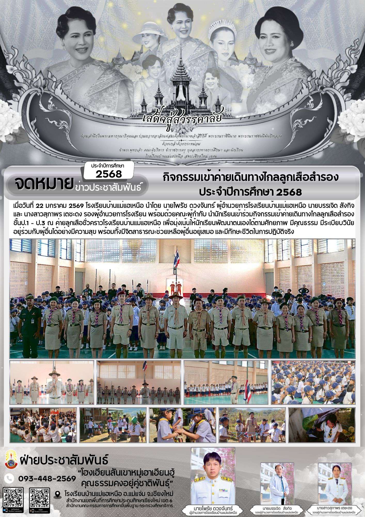 เมื่อวันที่ 22 มกราคม 2569 โรงเรียนบ้านแม่แฮเหนือ นำโดย นายไพรัช ดวงจันทร์ ผู้อำนวยการโรงเรียนบ้านแม่แฮเหนือ นายบรรเจิด สังกิจ และ นางสาวสุภาพร เตชะดง รองผู้อำนวยการโรงเรียน พร้อมด้วยคณะผู้กำกับ นำนักเรียนเข้าร่วมกิจกรรมเข้าค่ายเดินทางไกลลูกเสือสำรองชั้นป.1 – ป.3 ณ ค่ายลูกเสือชั่วคราวโรงเรียนบ้านแม่แฮเหนือ เพื่อมุ่งเน้นให้นักเรียนพัฒนาตนเองได้ตามศักยภาพ มีคุณธรรม มีระเบียบวินัย อยู่ร่วมกับผู้อื่นได้อย่างมีความสุข พร้อมทั้งมีจิตสาธารณะช่วยเหลือผู้อื่นอยู่เสมอ และมีทักษะชีวิตในการปฏิบัติจริง