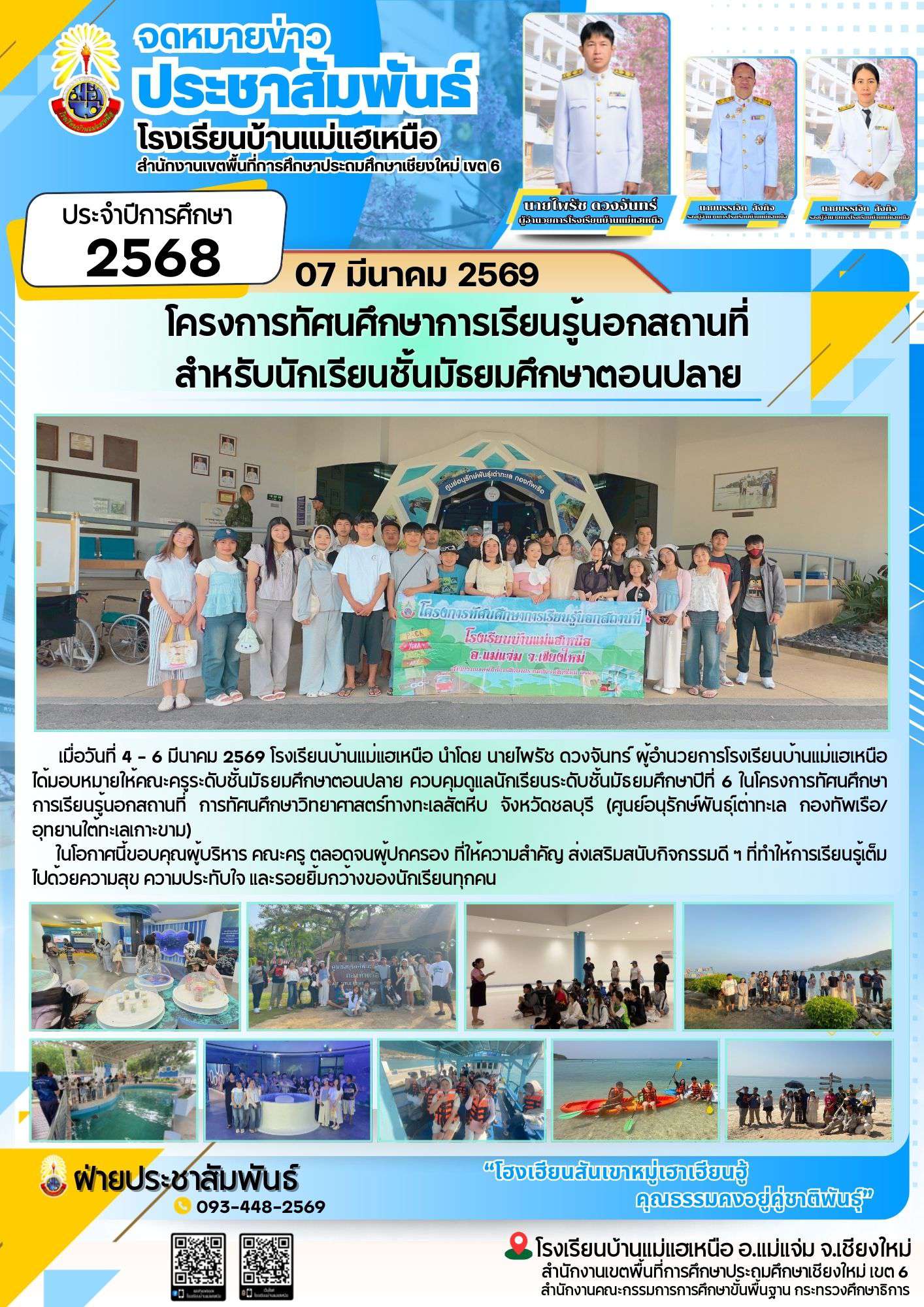 เมื่อวันที่ 4 - 6 มีนาคม 2569 โรงเรียนบ้านแม่แฮเหนือ นำโดย นายไพรัช ดวงจันทร์ ผู้อำนวยการโรงเรียนบ้านแม่แฮเหนือ ได้มอบหมายให้คณะครูระดับชั้นมัธยมศึกษาตอนปลาย ควบคุมดูแลนักเรียนระดับชั้นมัธยมศึกษาปีที่ 6 ในโครงการทัศนศึกษาการเรียนรู้นอกสถานที่ การทัศนศึกษาวิทยาศาสตร์ทางทะเลสัตหีบ จังหวัดชลบุรี (ศูนย์อนุรักษ์พันธุ์เต่าทะเล กองทัพเรือ/ อุทยานใต้ทะเลเกาะขาม)