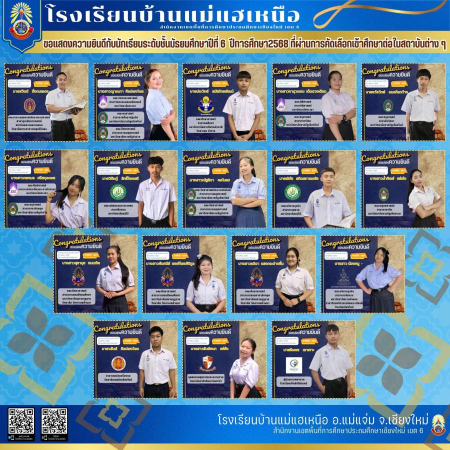 โรงเรียนบ้านแม่แฮเหนือ ขอแสดงความยินดีกับนักเรียนระดับชั้นมัธยมศึกษาปีที่ 6 ประจำปีการศึกษา 2568 ที่่ผ่านการคัดเลือกเข้าศึกษาต่อในสถาบันการศึกษาต่างๆ