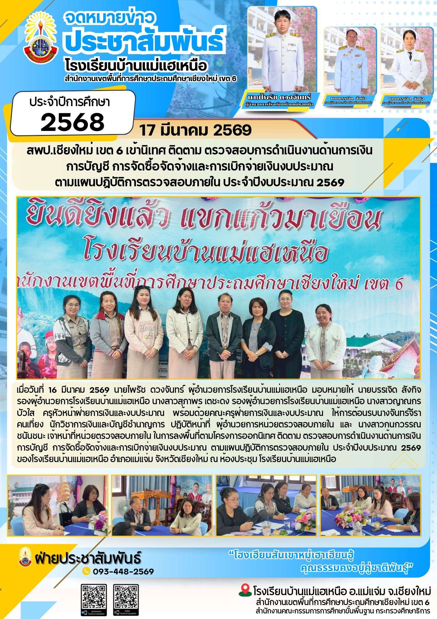 เมื่อวันที่16 มีนาคม 2569 นายไพรัช ดวงจันทร์ ผู้อำนวยการโรงเรียนบ้านแม่แฮเหนือ มอบหมายให้ นายบรรเจิด สังกิจ รองผู้อำนวยการโรงเรียนบ้านแม่แฮเหนือ นางสาวสุภาพร เตชะดง รองผู้อำนวยการโรงเรียนบ้านแม่แฮเหนือ นางสาวญาณกร บัวใส ครูหัวหน้าฝ่ายการเงินและงบประมาณ พร้อมด้วยคณะครูฝ่ายการเงินและงบประมาณ ให้การต้อนรบนางจันทร์จีรา คนเที่ยง นักวิชาการเงินและบัญชีชำนาญการ ปฏิบัติหน้าที่ ผู้อำนวยการหน่วยตรวจสอบภายใน และ นางสาวกนกวรรณ ชนันชนะ เจ้าหน้าที่หน่วยตรวจสอบภายใน ในการลงพื้นที่ตามโครงการออกนิเทศ ติดตาม ตรวจสอบการดำเนินงานด้านการเงิน การบัญชี การจัดซื้อจัดจ้างและการเบิกจ่ายเงินงบประมาณ ตามแผนปฏิบัติการตรวจสอบภายใน ประจำปีงบประมาณ 2569 ของโรงเรียนบ้านแม่แฮเหนือ อำเภอแม่แจ่ม จังหวัดเชียงใหม่ ณ ห้องประชุม โรงเรียนบ้านแม่แฮเหนือ
